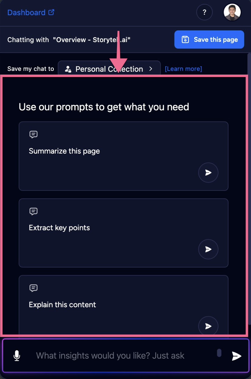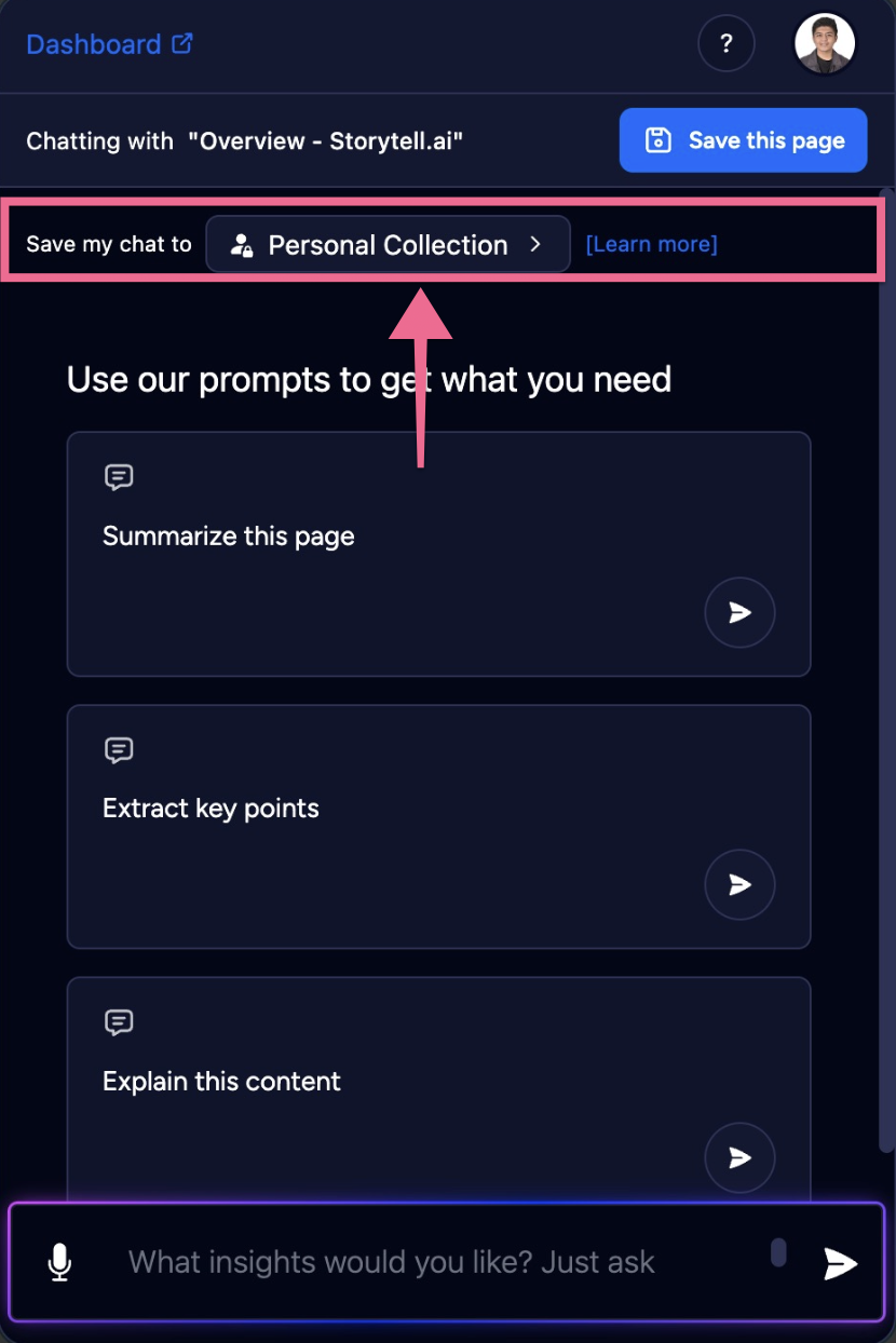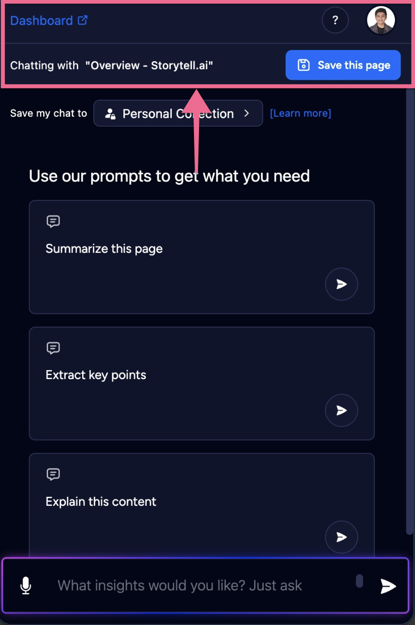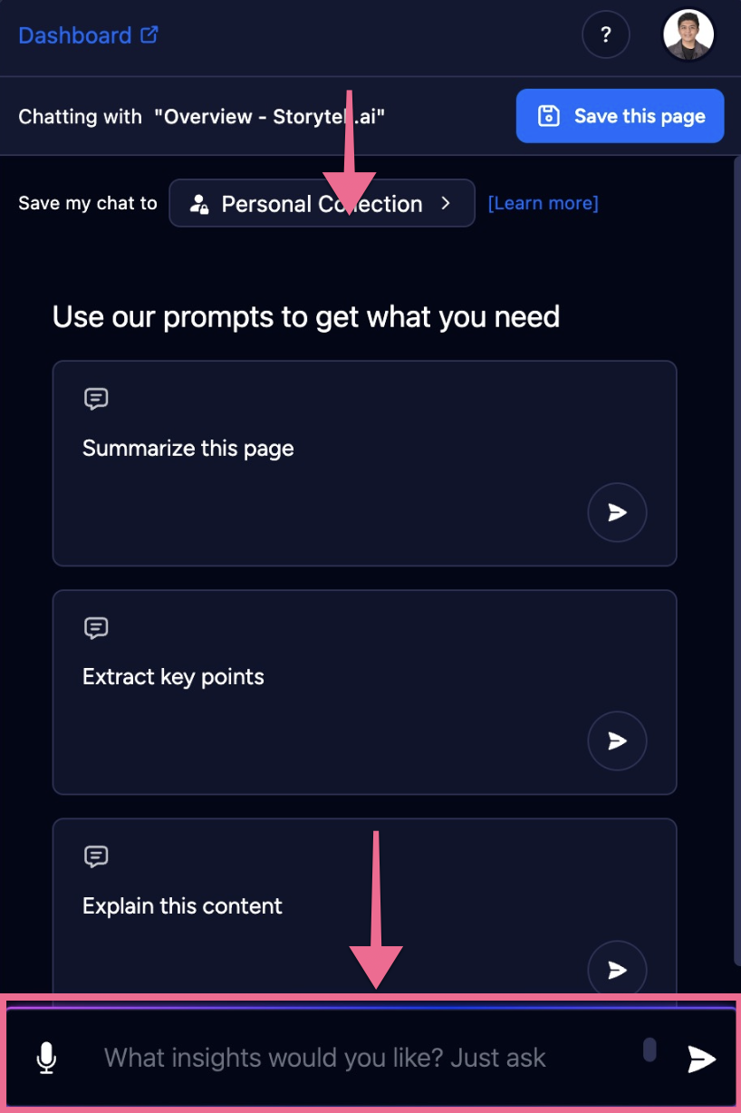 The Storytell Chrome Extension is a powerful tool that integrates seamlessly with your browser, allowing you to interact with web pages, save content, and leverage your personal knowledge base directly from Chrome.
